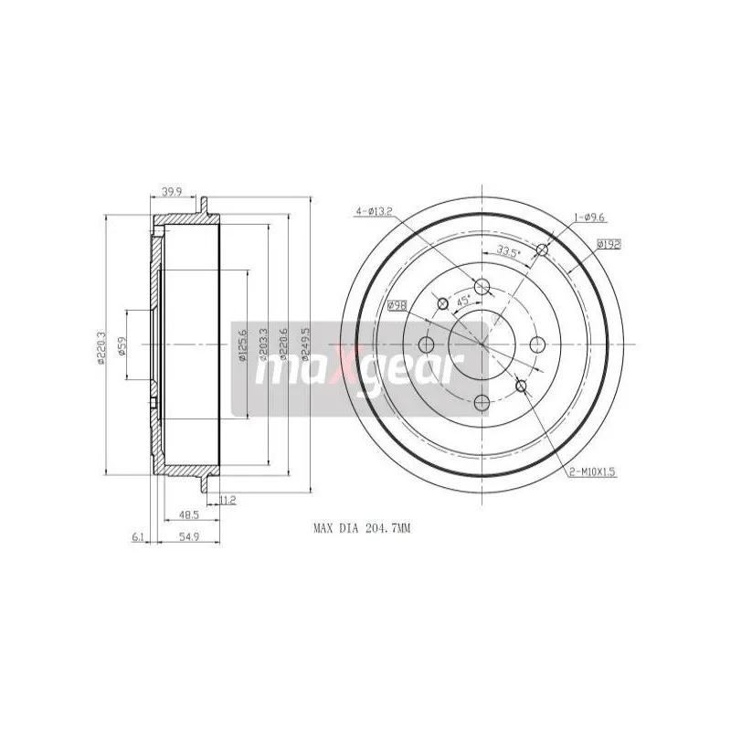 • Cotes max.de rectification de tambour de frein : 204,7 mm